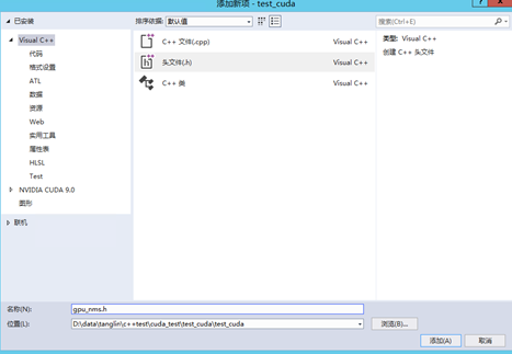 右键项目test_cuda->添加->新建项->选择visual c++头文件,命名为gpu_nms.h