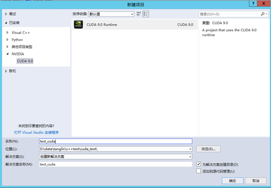 VS2017新建新建-项目-CUDA 9.0 Runtime , 输入项目名称 “test_cuda”此时会自动生成代码 kernel.cu :
