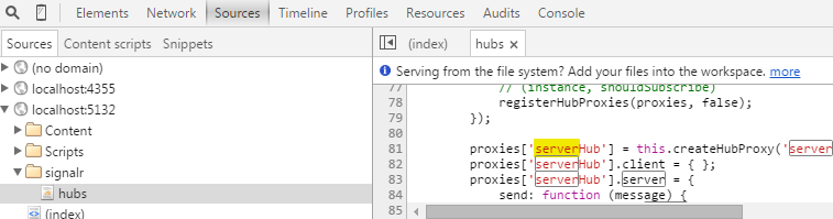 在第二部分介绍的时候说道,在服务端声明的所有Hub信息,都会生成JavaScript输出到客户端,为了验证这一点,可以在Chrome中F12来查看源码就明白了,具体如下图所示: