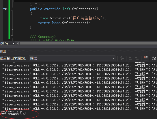 看到这里,有人是否会有疑问,前面的实现都只用到了集线器对象,而没有用到持久连接对象。其实并不是如此,$.connection这句代码就是使用持久连接对象,当然你也可以在重新OnConnected方法来查看监控客户端的连接情况,更新的代码如下所示: