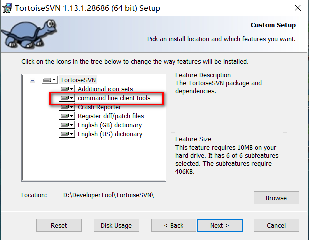 在右边选择我们安装目录下的svn命令,最后点击完成。