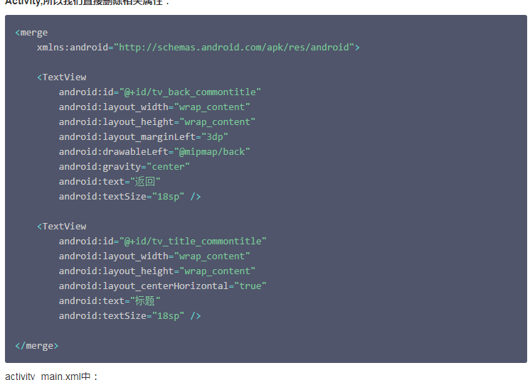 include便于对相同视图内容进行统一的控制管理,提高布局重用性,以标题栏为例,我们先定义一个通用的标题栏,相关代码如下: commont_title