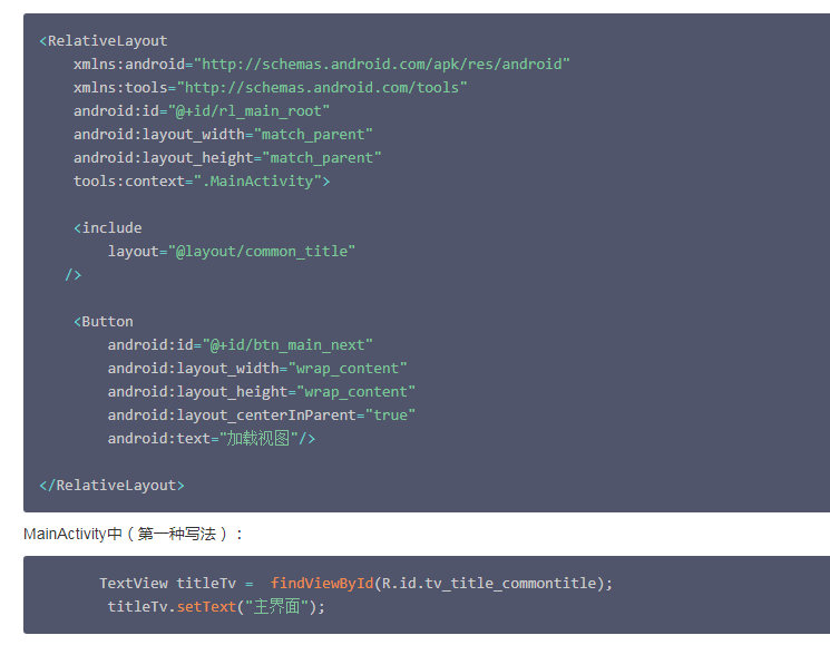 不能找到这个id,获取的RelativeLayout对象为null,这是为何?原来:如果给include设置了id,就会覆盖掉引用布局根布局的id,所以解决办法用两种: