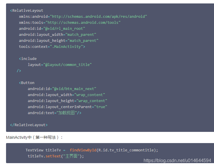 其实还有一种写法是不在xml中通过include引入,而是通过代码直接引入merge: 我们给activity_main.xml的根Relative设置id为 android:id="@+id/rl_main_root",在通过LayoutInflate.inflate方法渲染的时候, 第二个参数必须指定一个父容器,且第三个参数必须为true,也就是必须为merge下的视图指定一个父亲节