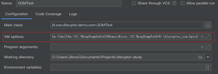 -Xms256m -Xmx256m -XX:+HeapDumpOnOutOfMemoryError -XX:HeapDumpPath=D:\disruptor_oom.hprof