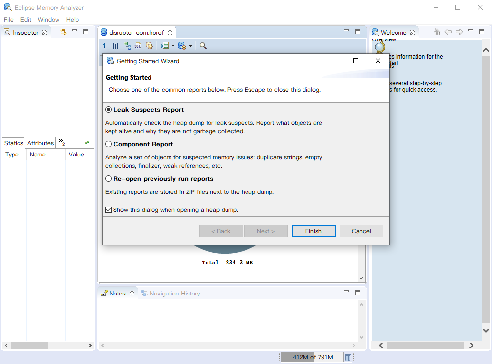 安装完毕后,点击 File -> Open Heap Dump 打开生成的 dump 文件,等待右下角加载完毕后,选择 Leak Suspects Report 打开分析报告。