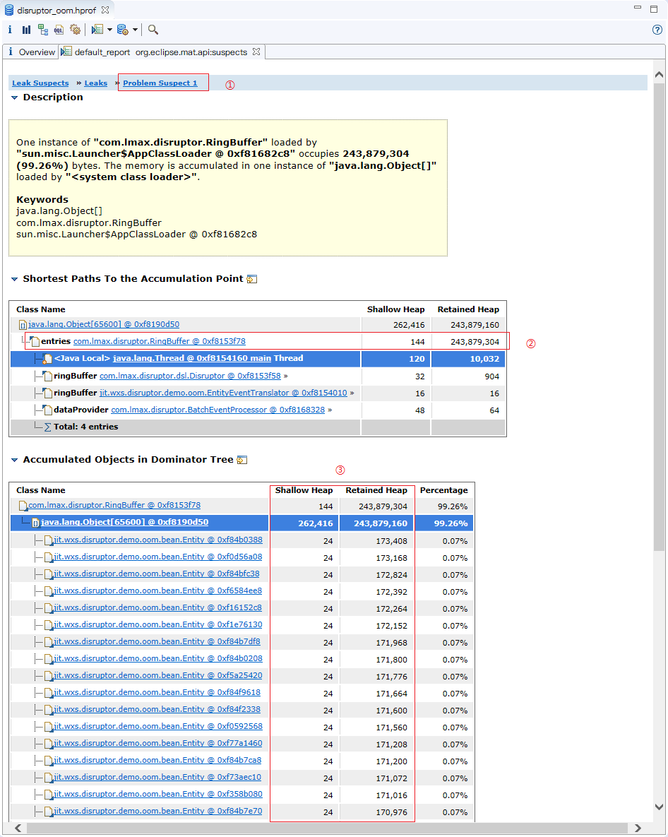 回到报告,在 ② 处说明了 RingBuffer 队列底层的 entries 数组,其 Shallow Heap 只有 144 byte,而 Retained Heap 有 243879304 byte,说明其引用了大量可以被 GC 的对象。在 ③ 处展示 entries 数组中每一项元素,也可以看出来。