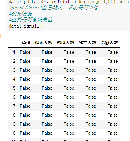 data1=pd.DataFrame(Total,index=range(1,35),columns=['省份','确诊人数','疑似人数','死亡人数','治愈人数'])