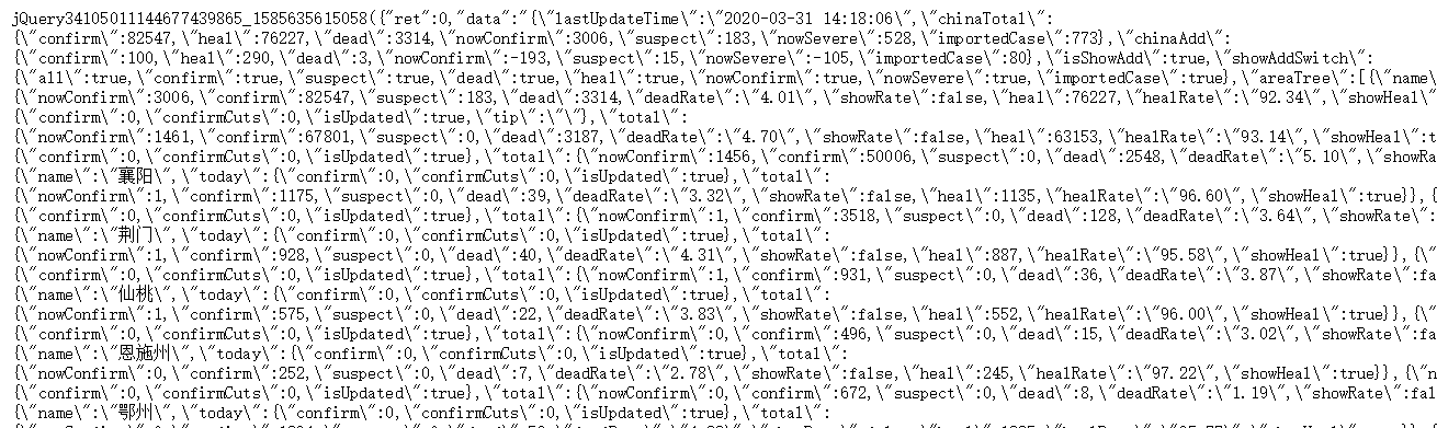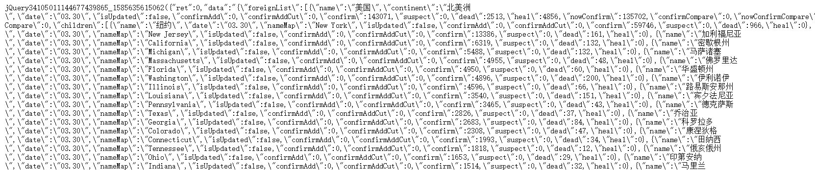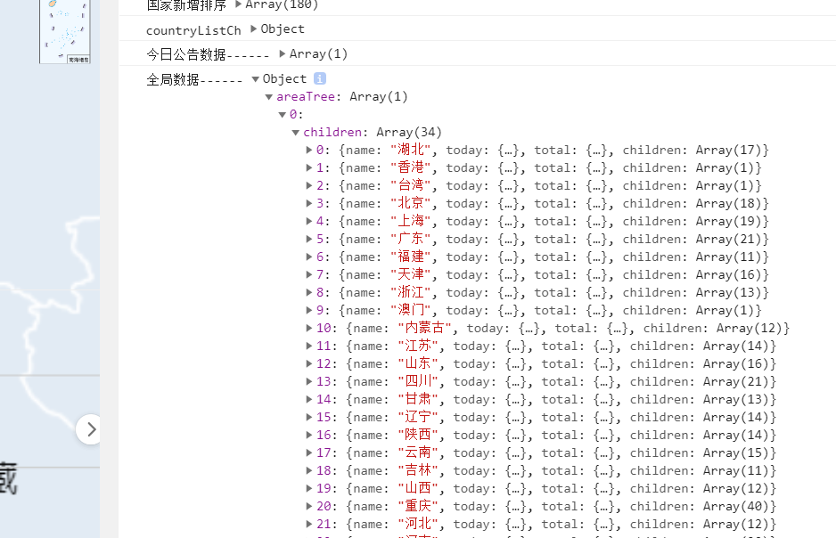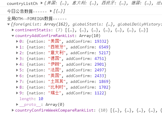 可以看到我国的疫情数据在areaTree标签下的0标签下的子标签里,外国数据在countryAddConfirmRankList标签下所以使用以下代码: