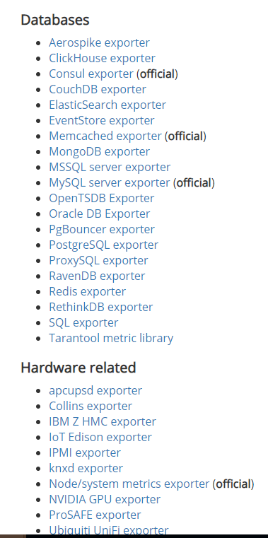 - 官网上有很多的exporter模版可以直接拿来使用:https://prometheus.io/docs/instrumenting/exporters/