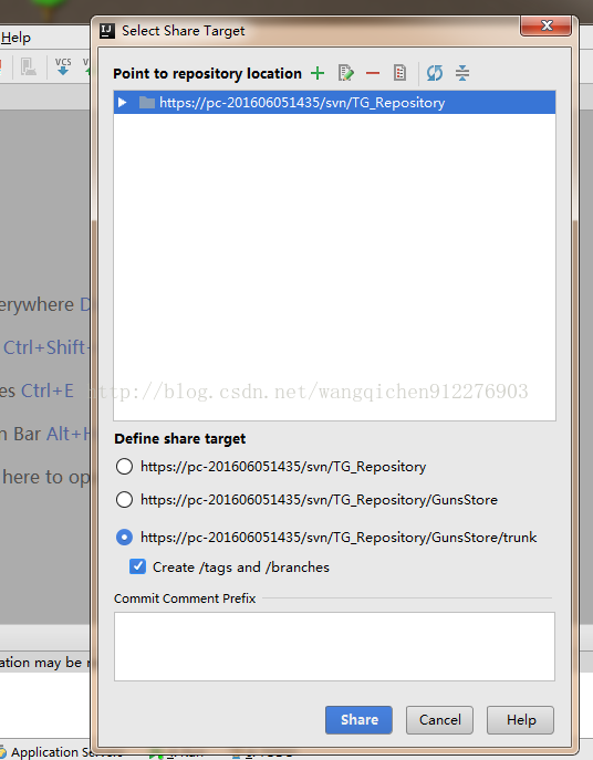 5、点击绿色的+号,选择一个SVN仓库的地址,下面可以选择上传到SVN仓库的目录格式,然后点击Shard