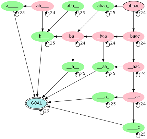 以$s=abaac$为例,图大概长这个样子(其中红点和绿点表示两种不同的转移)