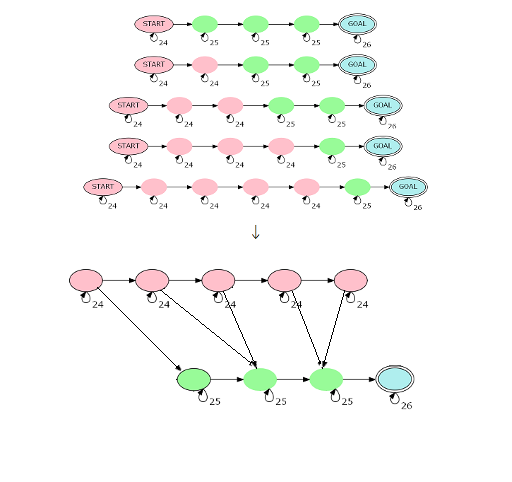 如果是$n+m$,我们先进行${n+m+1\over 2}$次矩乘,然而发现如果存在某个$s_i=s_{i+1}$且这两个都是被$S$最中间那个字符匹配的话,实际上是不合法的,但是被我们算进去了,所以要去掉这种情况,我们建一张新图,红点绿点之间的边为走过$i$个红点之后待匹配的为$k$和$k+1$且$s_k=s_{k+1}$的方案数,且去掉最终终点的自环,这样方案数就没问题了