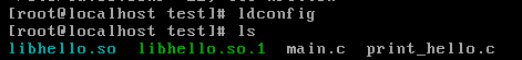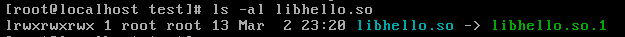 我们会发现,执行ldconfig命令后,当前目录下生成了一个新的文件libhello.so(这是-soname,libhello.so选项导致的,如果没有该选项,那么ldconfig执行后不会生成新文件libhello.so。),使用ls命令会发现此文件是libhello.so.1的链接文件: