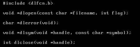 phandle = dlopen("./libhello.so", RTLD_LAZY); if(!phandle) { printf("Failed load library!\n"); } perr = dlerror(); if(perr != NULL) { printf("%s\n", perr); return(0); } printhello = dlsym(phandle, "print_hello"); perr = dlerror(); if(perr != NULL) { printf("%s\n", perr); return(0); } (*printhello)(); dlclose(phandle);