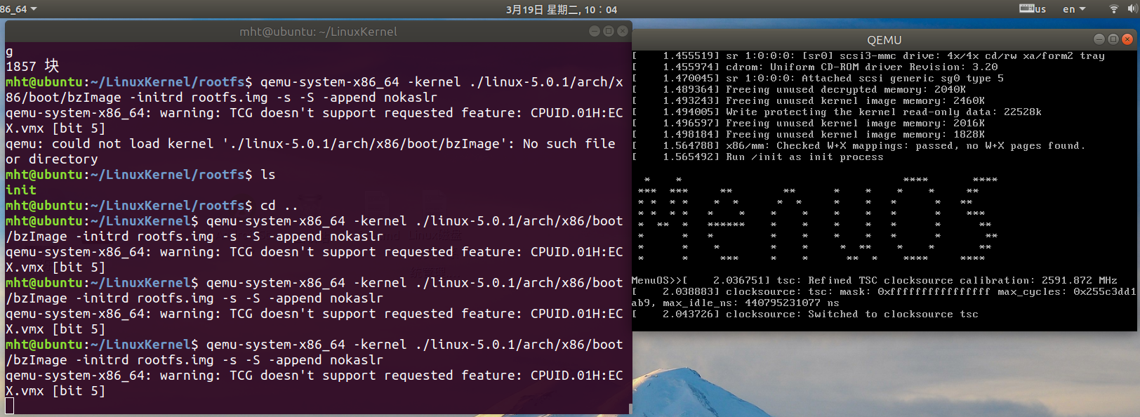 qemu-system-x86_64 -kernel ./linux-5.0.1/arch/x86/boot/bzImage -initrd rootfs.img -s -S -append nokaslr