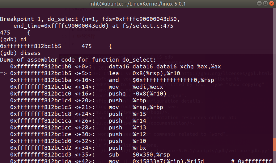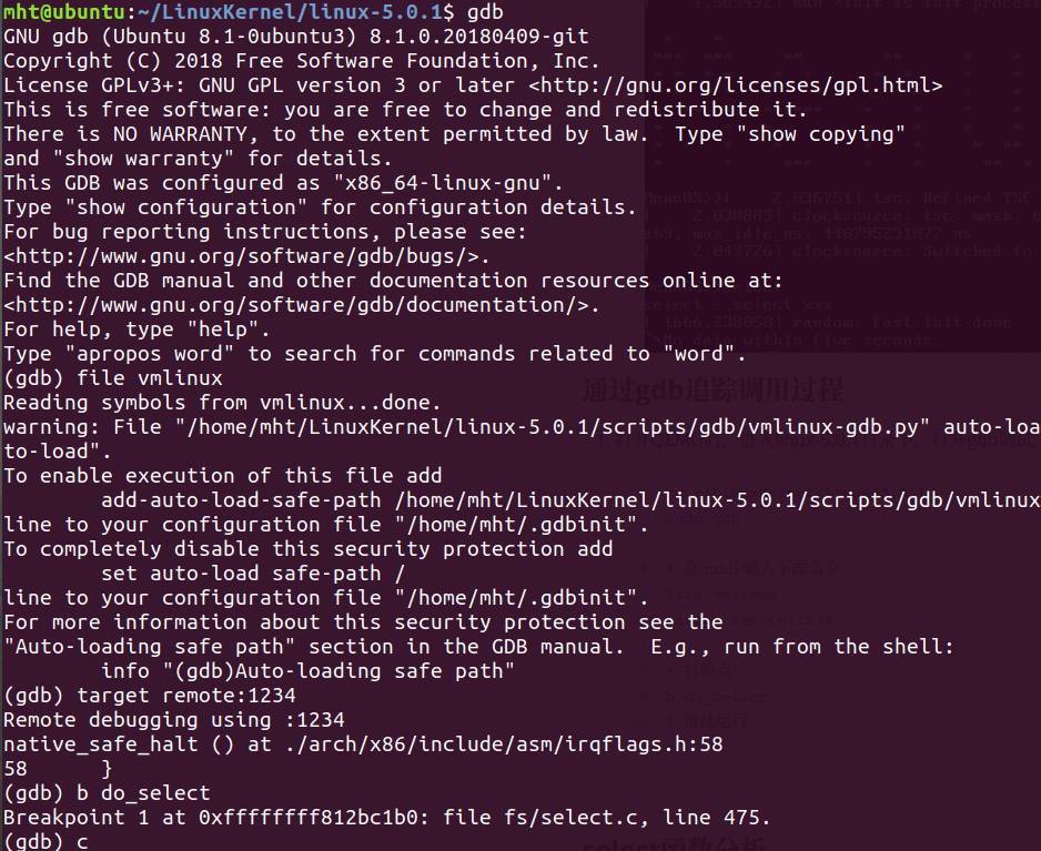 cd ~/LinuxKernel/linux-5.0.1 sudo gdb # 在gdb中输入下面命令 file vmlinux target remote:1234 # 打断点 b do_select # 继续运行 c