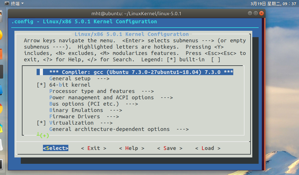 # 解压 mkdir ~/LinuxKernel tar -xv -f ~/Download/linux-5.0.1.tar.xz -C ~/LinuxKernel# 配置编译 cd ~/LinuxKernel/linux-5.0.1 make menuconfig # 基于文本选单的配置界面