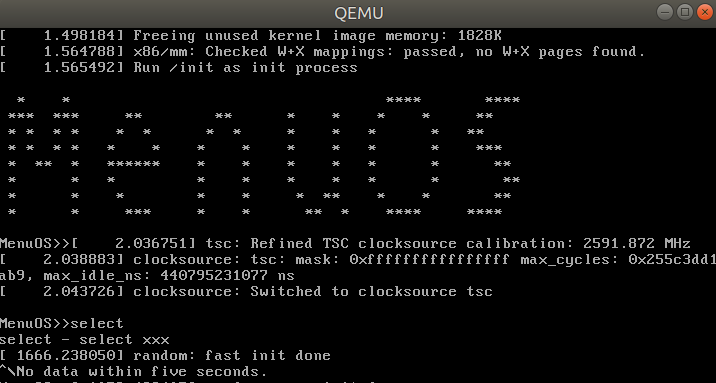 cd menu gcc -pthread -o init linktable.c menu.c test.c -m32 -static cd ../rootfs cp ../menu/init ./ find . | cpio -o -Hnewc |gzip -9 > ../rootfs.img