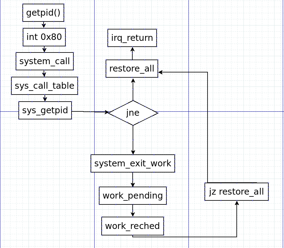 - 指令流执行到系统调用函数时,系统调用函数通过int 0x80指令进入系统调用入口程序,并且把系统调用号放入%eax中,如果需要传递参数,则把参数放入%ebx,%ecx和%edx中。