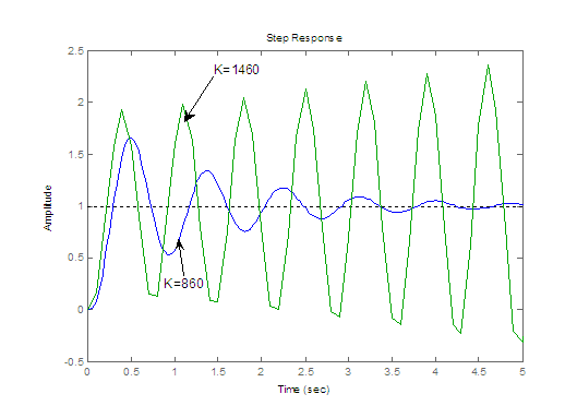 用rlocus(GH)命令绘制 。可以使用[K,p] = rlocfind(GH)命令以交互方式选择根轨迹上的点(将十字准线放置在适当的位置)。然后MATLAB 在该点产生增益K以及具有该增益的所有极点p。根轨迹可以在使用sgrid(zeta,wn)命令生成的网格上绘制,该命令允许恒定阻尼比zeta和恒定固有频率 wn曲线。命令rlocus(GH,K)允许我们指定用于绘制根轨迹的增益K的范围。还研究命令[p,K] = rlocus(GH) 和 [p] = rlocus(GH,K) 使用MATLAB在线帮助。
