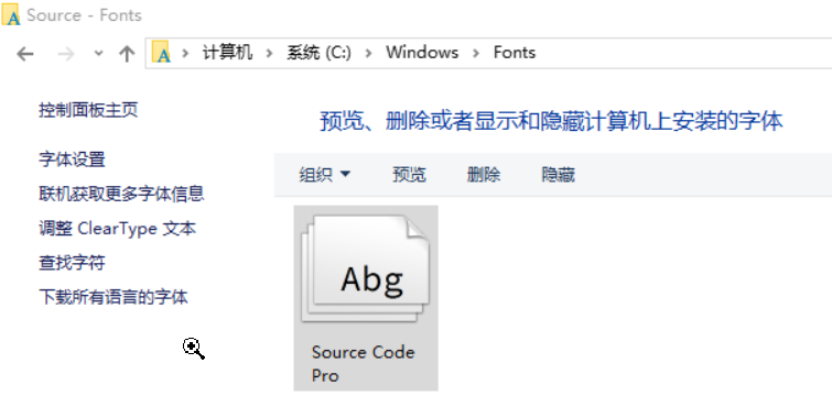 - Windows 下解压安装包,TTF文件夹下的文件是我们需要安装的字体。 打开TTF文件夹,将后缀名为.ttf的文件copy到C:\Windows\Fonts目录下,copy完成后,下面会出现Source Code,双击打开,会发现windows字体已经归类,这就表示安装完成了。