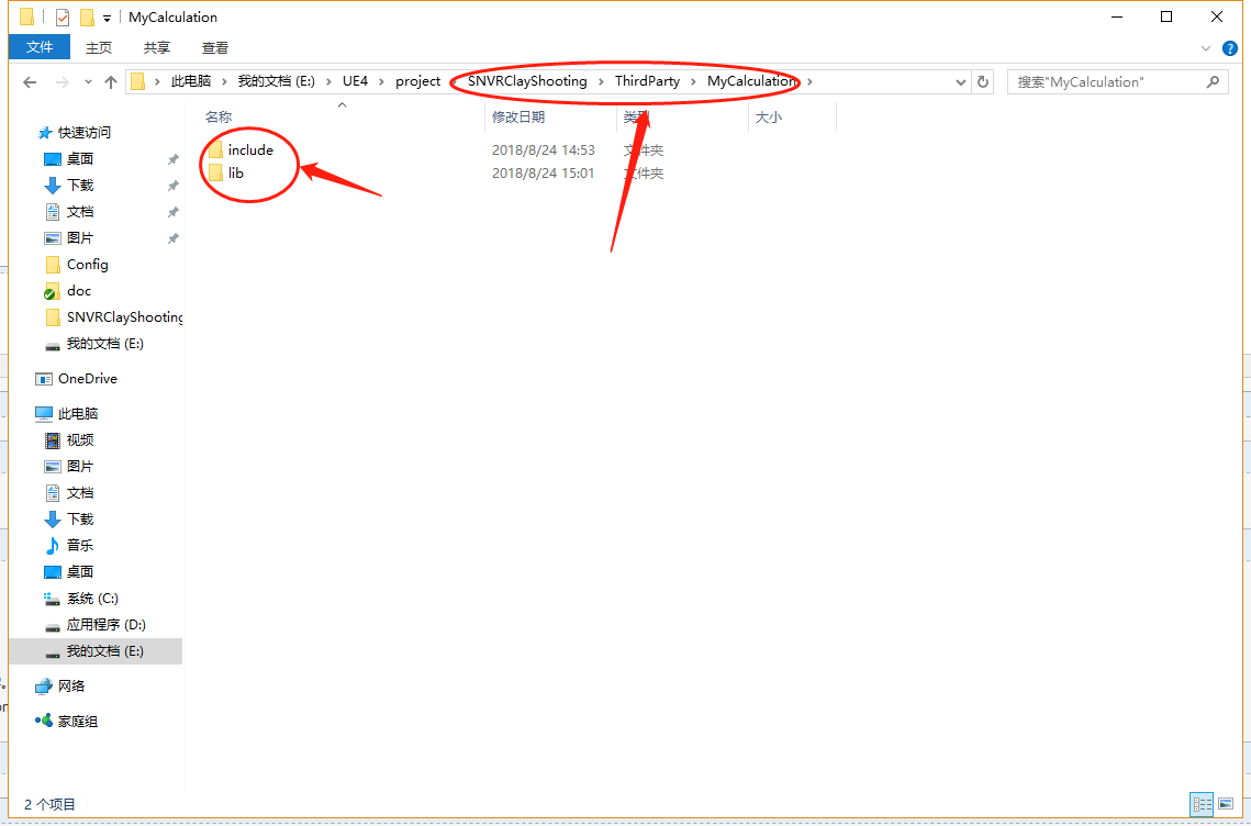 2,新建一个UE4项目工程A.uproject,在期工程目录下建立一个层级文件夹,分别命名为ThirdParty-MyCalculation-inluce/lib,如下图