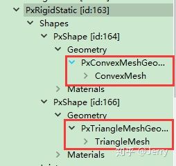 展开这个PxRigidStatic,发现它有两个PxShape,展开Geometry,可以看到分别是凸包模型(ConvexMesh)与三角形模型(TriangleMesh),如下: