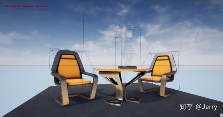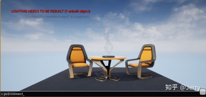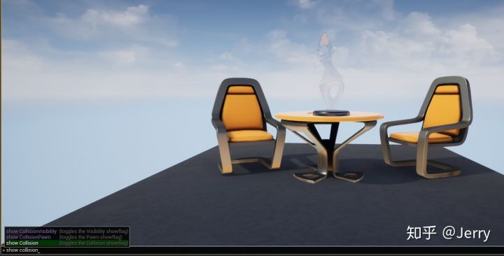 可以看到两个椅子,还有一个桌子,桌子上放着一个雕塑模型,这与之前在UE4里面按show collision得到的结果是一致的,是较为粗糙的轮廓包围盒,至于靠右的圆柱,那是玩家的出生点,因为有碰撞所以也会被物理世界采集到。