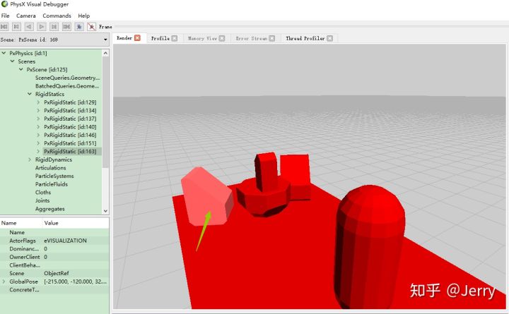 每一个物理对象在PhyX里面都对应一个PxRigid,如果这个对象是静态的,则是PxRigidStatic,在PVD里面绘制成红色;如果这个对象是动态的,则是PxRigidDynamic,在PVD里面绘制成黄色的。这里所有非休眠对象都是静态的,所以上图看上去都是红色的。可以选中其中的一个模型,比如左侧的椅子,可以看到左侧面板上列出了它对应的那个PxRigidStatic,id是163,如下: