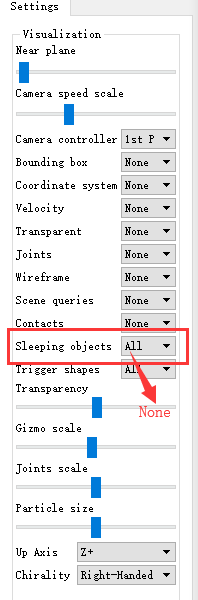 在右侧Setting栏里面把Sleeping objects给关掉,如下: