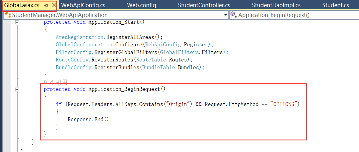 配置了Web.config文件后,平常使用的GET,POST可以使用,但是使用PUT请求的时候还是会报405的错,即method not allow,然后需要配置Global.asax文件