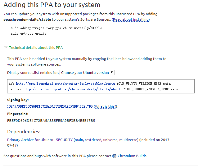 实际上,执行命令sudo add-apt-repository ppa:chromium-daily/stable,即向/etc/apt/sources.list 源文件列表自动添加了(以下两行)两个软件源:(下图为chromium页面相关介绍)