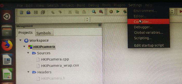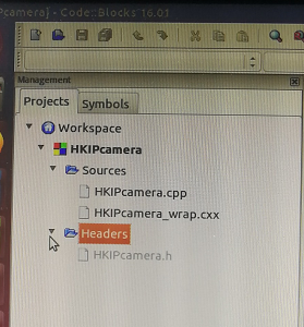 然后,利用codeblocks进行编译(实际上也可用命令行编译,但由于依赖库、头文件太多、命令行比较长...),在codeblocks中新建shared library工程,依此选择GO---Next---C++----工程名取为“HKIPcamera”(路径为 /home/rcnn/HK_Double_Camera/HKIPcamera)---next---finish,删除新建工程的main.cpp,右键工程名Add files----选择文件----确定,依此添加HKIPcamera.cpp,HKIPcamera.h,HKIPcamera_wrap.cxx文件
