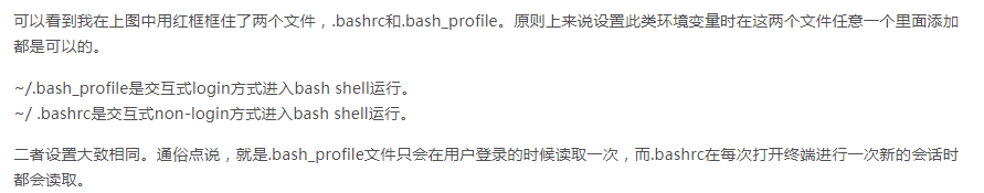 用户级变量设置路径为~/.bashrc、~/.bash_profile等(用户主目录~下隐藏文件),bashrc负责控制台调用的环境变量,profile负责本用户所有环境变量的设置。