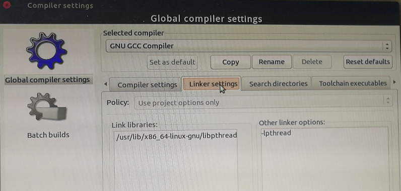 主界面---Settings---Compiler settings---Linker settings---左边Linker libraries 添加 /usr/lib/x86_64-linux-gnu/libpthread.a 右边 Other linker options 添加 -lpthread,如下图所示: (与海康威视源文件中多线程有关,cpp文件中含头文件 pthread.h)