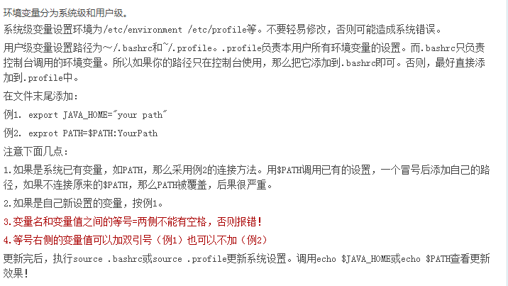 系统级变量设置环境为/etc/environment、/etc/profile等,不要轻易修改,易造成系统错误。