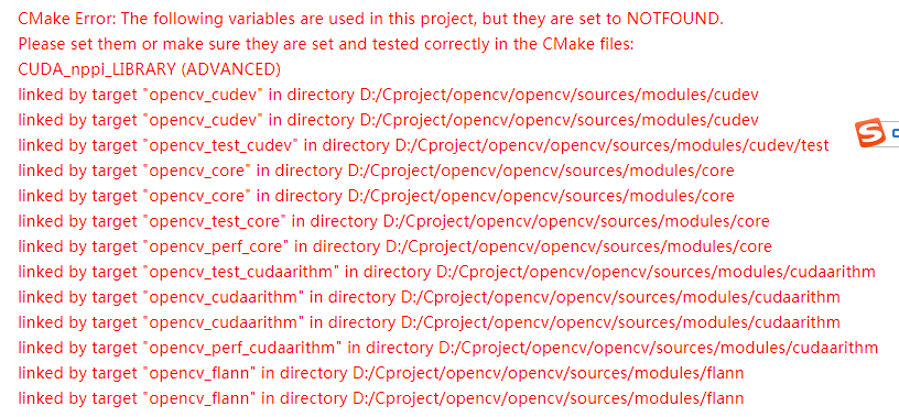 若在编译安装opencv前机器预装了cuda9.0,直接按上文“二”中编译安装方式将会报错如下: