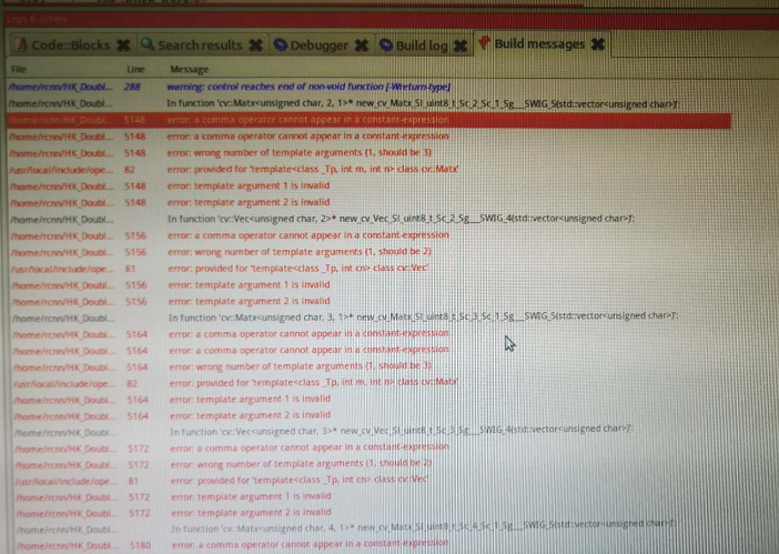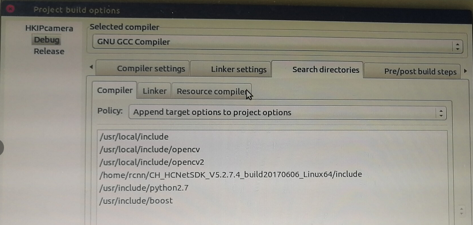 Build options---Search directories – Compiler中添加所有头文件路径:/usr/local/include/ 、/usr/local/include/opencv、/usr/local/include/opencv2、