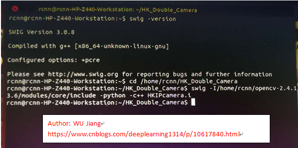 在上述参考博客中,执行命令sudo apt-get install swig安装swig,可能会在最后编译.so动态链接库阶段产生如下报错:error:a comma operator cannot appear in a constant-expression...error:template argument 2 is invalid In function'cv::Vec<unsigned char,2>'*new_cv_Vec_Sl_uint8_t_Sc_2_Sg_SWIG_4(std::vec...。经过反复验证,发现是swig在封装得到的.cxx文件(6万行)中多余了很多小括号,若一行行去掉小括号该行不再报错。考虑到这主要是swig版本的问题(可能是软件源导致的问题,但又没找到合适的软件源),在ubuntu16.04上按上述更新源并安装的swig版本为swig3.0.8,而在ubuntu14.04却是swig2.0.11,若想安装swig3.0,需要执行sudo apt-get install swig3.0,但源中的版本是swig3.0.2,仍然会在最后编译时产生如上报错。这里,个人推荐先按sudo apt-get install swig或swig3.0安装,然后执行swig -version查看swig版本,若不是swig3.0.8建议执行sudo apt-get remove swig删除swig,并采用以下编译安装方法:(附swig下载地址),首先将swig-3.0.8压缩包拷贝至工程所在目录(本文中为/home/rcnn/HK_Double_Camera),执行以下命令:
