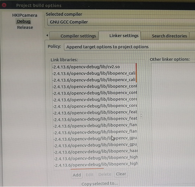 Build options---Linker settings---Linker libraries中添加opencv和海康威视SDK的所有库文件路径,如下图所示,分别进入/home/rcnn/opencv-2.4.13.6/opencv-debug/lib/、