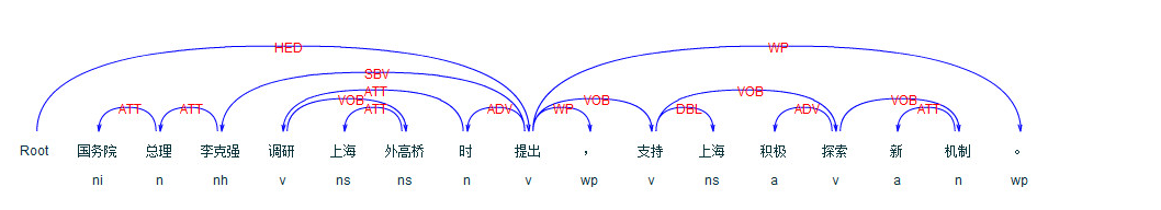 从分析结果中我们可以看到,句子的核心谓词为“提出”,主语是“李克强”,提出的宾语是“支持上海…”,“调研…时”是“提出”的 (时间) 状语,“李克强”的修饰语是“国务院总理”,“支持”的宾语是“探索 新机制”。有了上面的句法分析结果,我们就可以比较容易的看到,“提出者”是“李克强”,而不是“上海”或“外高桥”,即使它们都是名词,而且距离“提出”更近。