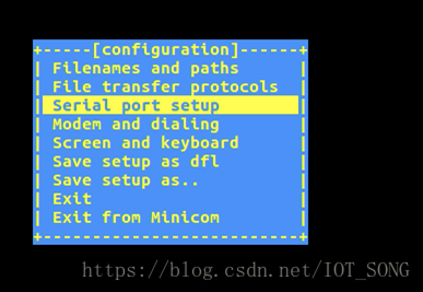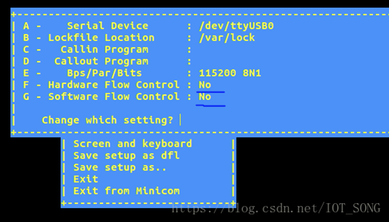 便进入了minicom的配置界面,使用上下键选择Serial port setup,回车。此时光标在“change which setting”后面停留,它的上面有如下菜单: