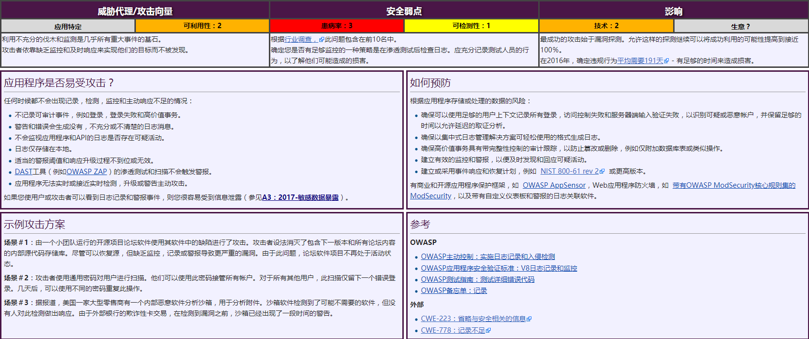 不足的日志记录和监控,以及事件响应缺失或无效的集成,使攻击者能够进一步攻击系统、保持持续性或转向更多系统,以及篡改、提取或销毁数据。大多数缺陷研究显示,缺陷被检测出的时间超过200天,且通常通过外部检测方检测,而不是通过内部流程或监控检测。