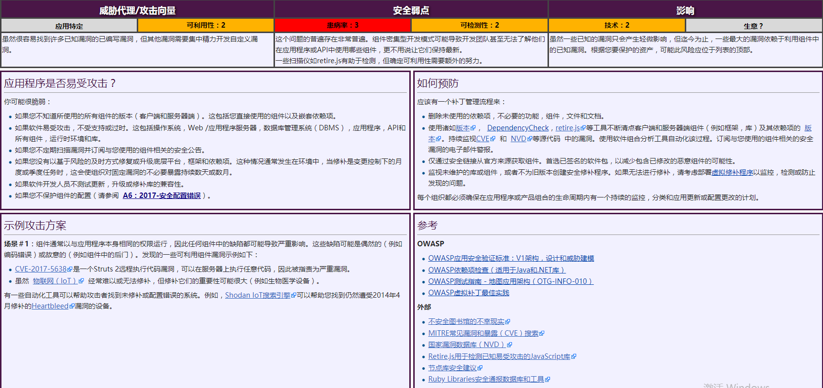 组件(例如:库、框架和其他软件模块)拥有和应用程序相同的权限。如果应用程序中含有已知漏洞的组件被攻击者利用,可能会造成严重的数据丢失或服务器接管。同时,使用含有已知漏洞的组件的应用程序和API可能会破坏应用程序防御、造成各种攻击并产生严重影响。