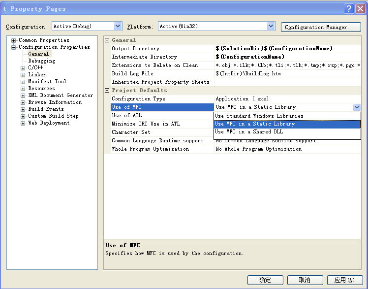 1.在工程目录下右键选择"Properties”--->"Configuration Properties”--->“General”--->"Use of MFC"--->"Use MFC in a Static Library",