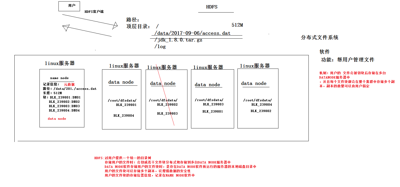 1、客户把一个文件存入hdfs,其实hdfs会把这个文件切块后,分散存储在N台linux机器系统中(负责存储文件块的角色:data node)<准确来说:切块的行为是由客户端决定的>