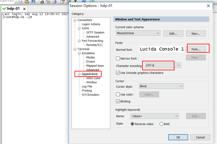 用crt连接上后,修改一下crt的显示配置(字号,编码集改为UTF-8):