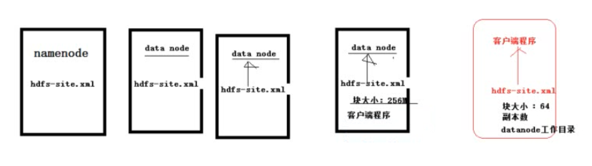 虽然服务端和客户端的共用配置 core-default.xml core-site.xml;hdfs-default.xml hdfs-site.xml,但是不同的程序所需要的参数不同,只不过为了方便,所有参数都写在一个文件中了。即是在服务器的hdfs-site.xml中配置了切块大小和副本数量,服务器的namenode和datanode根本不关心也不使用这些参数,只有启动服务器上的命令行客户端时,该参数才可能起作用。