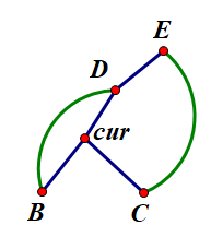 其中那两个点为$cur, D$为答案的两个点。第一条路径为$cur \to D$,第二条为$cur \to B \to D$,第三条为$cur \to C \to E \to D$。
